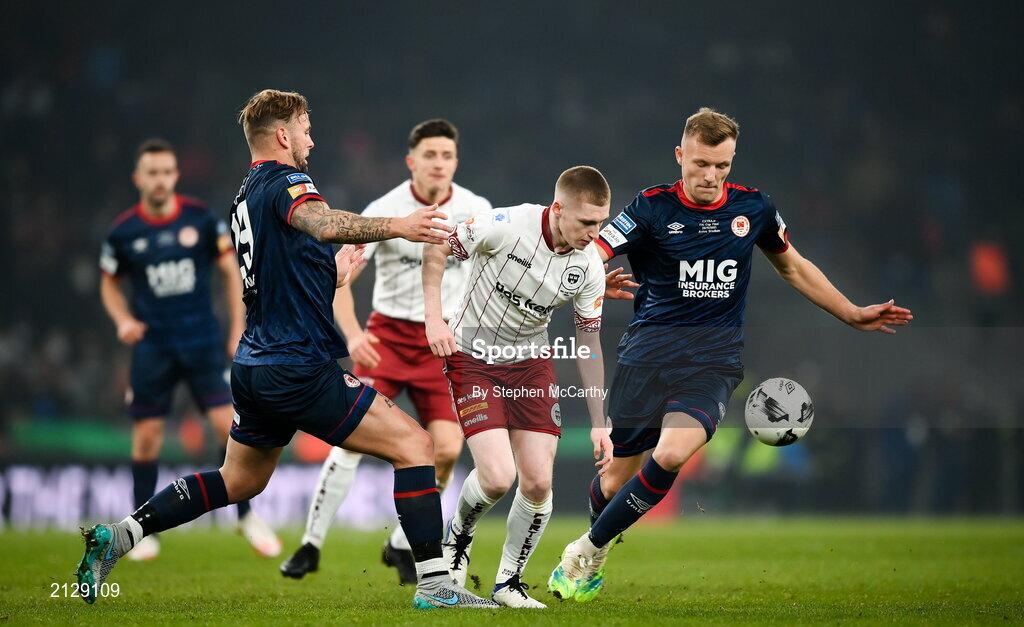 28 November 2021; Ross Tierney of Bohemians in action against Paddy Barrett, left, and Jamie Lennon of St Patrick's Athletic during the Extra.ie FAI Cup Final match between Bohemians and St Patrick's Athletic at Aviva Stadium in Dublin. Photo by Stephen McCarthy/Sportsfile