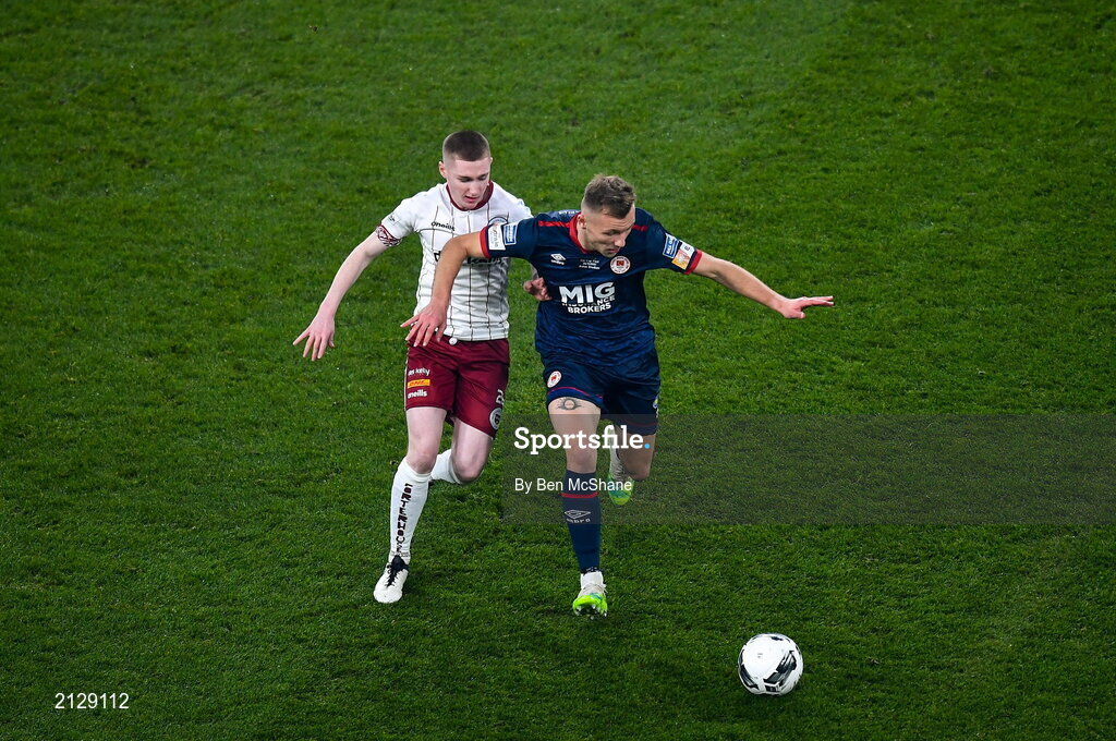 28 November 2021; Jamie Lennon of St Patrick's Athletic in action against Ross Tierney of Bohemians during the Extra.ie FAI Cup Final match between Bohemians and St Patrick's Athletic at Aviva Stadium in Dublin. Photo by Ben McShane/Sportsfile