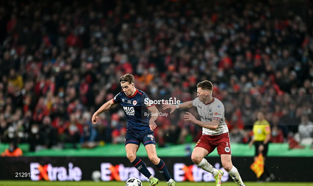 28 November 2021; Matty Smith of St Patrick's Athletic in action against Andy Lyons of Bohemians during the Extra.ie FAI Cup Final match between Bohemians and St Patrick's Athletic at Aviva Stadium in Dublin. Photo by Seb Daly/Sportsfile