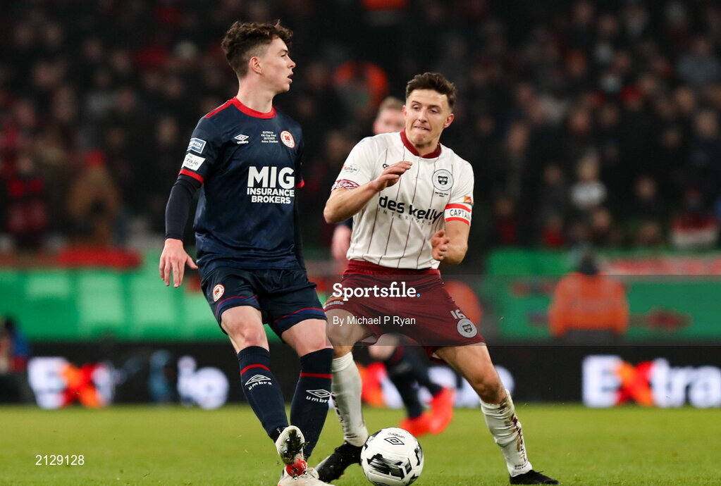 28 November 2021; Alfie Lewis of St Patrick's Athletic in action against Keith Buckley of Bohemians during the Extra.ie FAI Cup Final match between Bohemians and St Patrick's Athletic at Aviva Stadium in Dublin. Photo by Michael P Ryan/Sportsfile