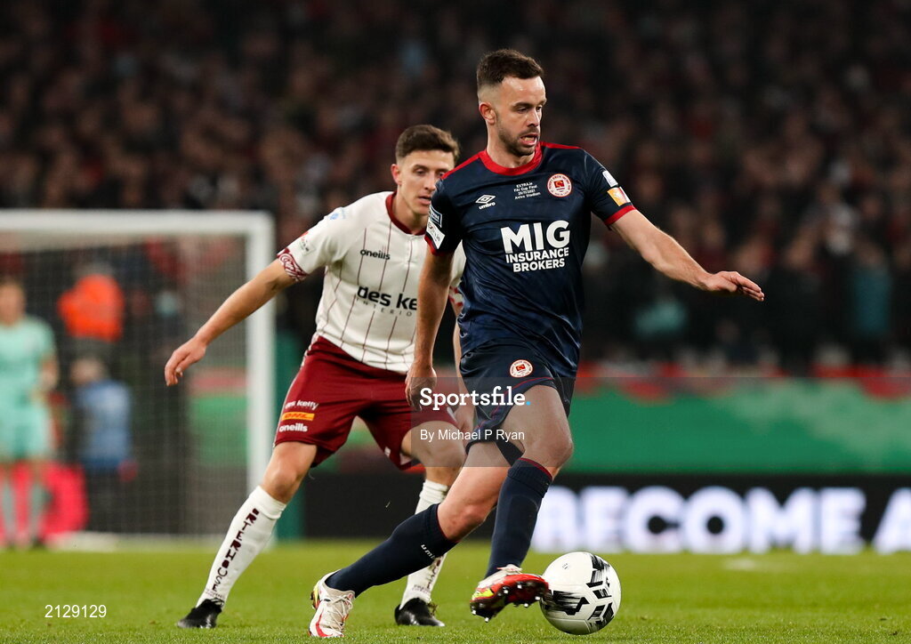 28 November 2021; Robbie Benson of St Patrick's Athletic in action against Keith Buckley of Bohemians during the Extra.ie FAI Cup Final match between Bohemians and St Patrick's Athletic at Aviva Stadium in Dublin. Photo by Michael P Ryan/Sportsfile