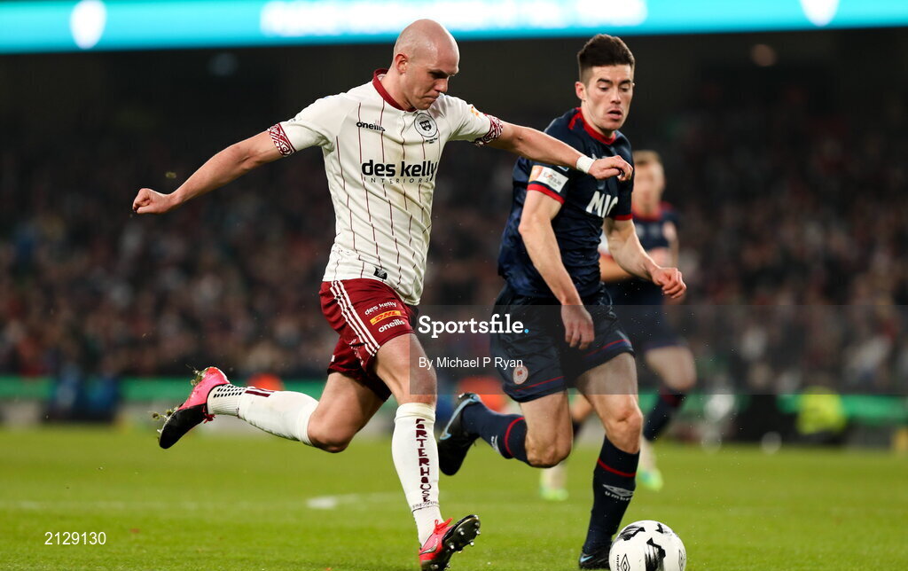 28 November 2021; Georgie Kelly of Bohemians in action against Lee Desmond of St Patrick's Athletic during the Extra.ie FAI Cup Final match between Bohemians and St Patrick's Athletic at Aviva Stadium in Dublin. Photo by Michael P Ryan/Sportsfile