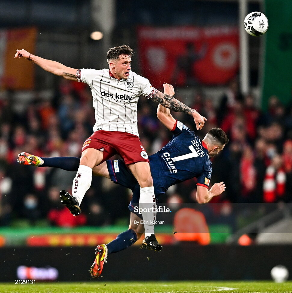 28 November 2021; Rob Cornwall of Bohemians and Robbie Benson of St Patrick's Athletic during the Extra.ie FAI Cup Final match between Bohemians and St Patrick's Athletic at Aviva Stadium in Dublin. Photo by Eóin Noonan/Sportsfile