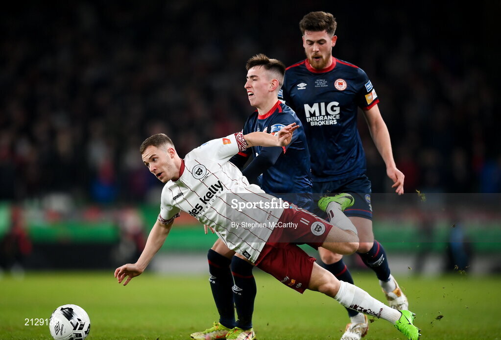 28 November 2021; Liam Burt of Bohemians and Darragh Burns of St Patrick's Athletic during the Extra.ie FAI Cup Final match between Bohemians and St Patrick's Athletic at Aviva Stadium in Dublin. Photo by Stephen McCarthy/Sportsfile