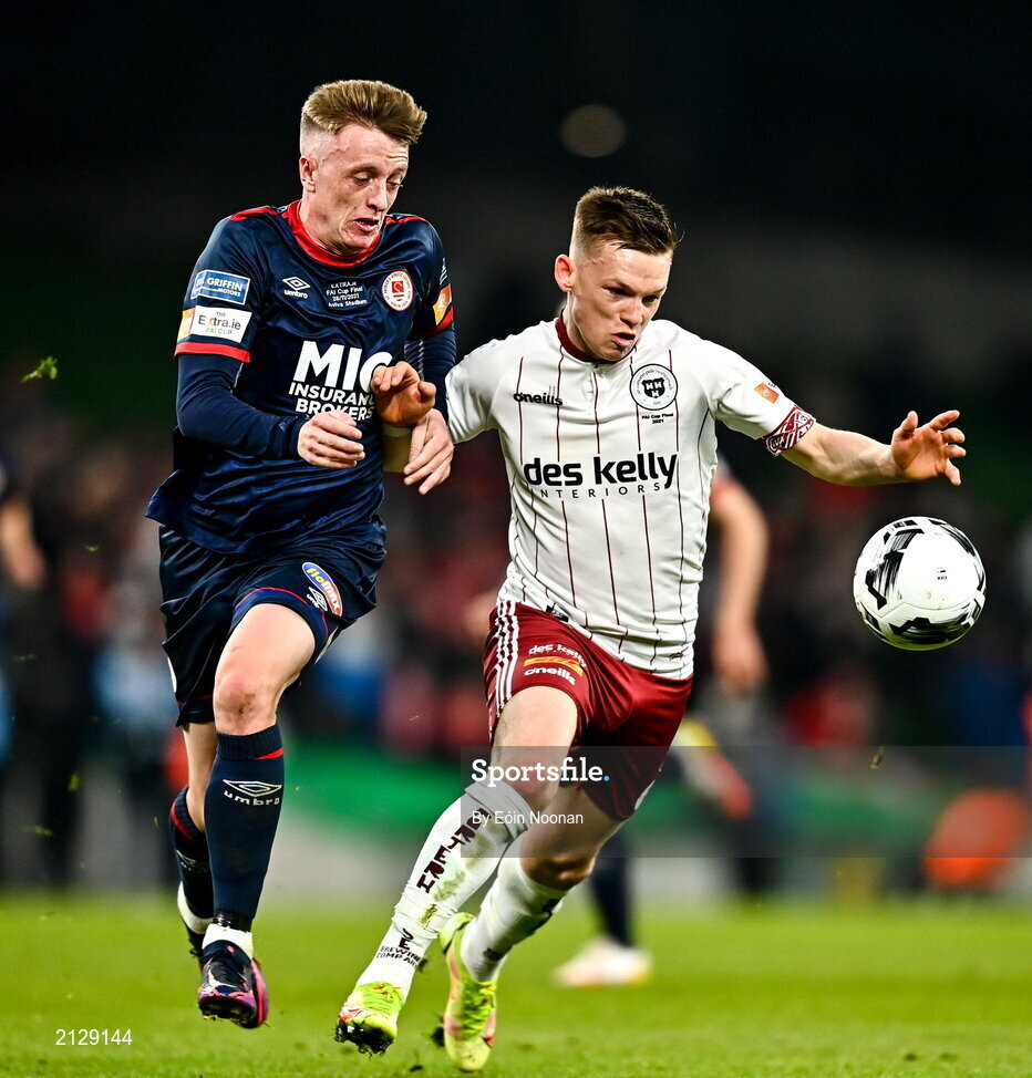 28 November 2021; Andy Lyons of Bohemians and Chris Forrester of St Patrick's Athletic during the Extra.ie FAI Cup Final match between Bohemians and St Patrick's Athletic at Aviva Stadium in Dublin. Photo by Eóin Noonan/Sportsfile