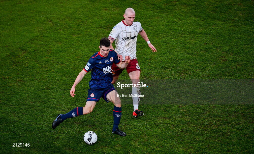 28 November 2021; Lee Desmond of St Patrick's Athletic in action against Georgie Kelly of Bohemians during the Extra.ie FAI Cup Final match between Bohemians and St Patrick's Athletic at Aviva Stadium in Dublin. Photo by Ben McShane/Sportsfile