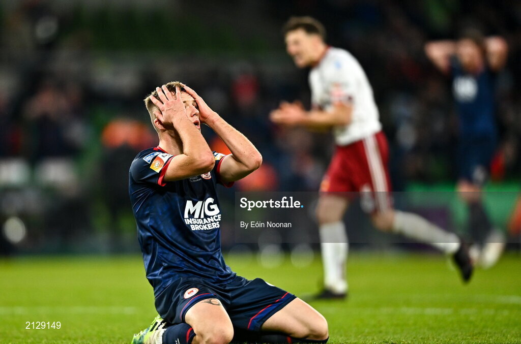 28 November 2021; Jamie Lennon of St Patrick's Athletic reacts after a missed goal chance during the Extra.ie FAI Cup Final match between Bohemians and St Patrick's Athletic at Aviva Stadium in Dublin. Photo by Eóin Noonan/Sportsfile