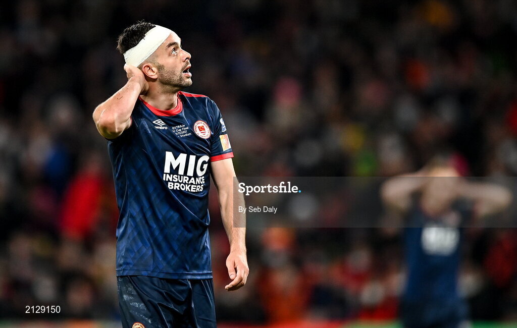 28 November 2021; Robbie Benson of St Patrick's Athletic reacts after a missed goal chance during the Extra.ie FAI Cup Final match between Bohemians and St Patrick's Athletic at Aviva Stadium in Dublin. Photo by Seb Daly/Sportsfile