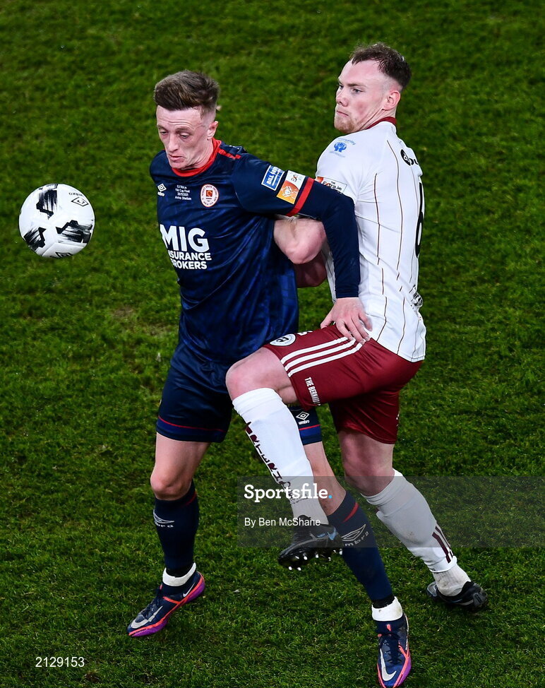 28 November 2021; Chris Forrester of St Patrick's Athletic in action against Ciarán Kelly of Bohemians during the Extra.ie FAI Cup Final match between Bohemians and St Patrick's Athletic at Aviva Stadium in Dublin. Photo by Ben McShane/Sportsfile