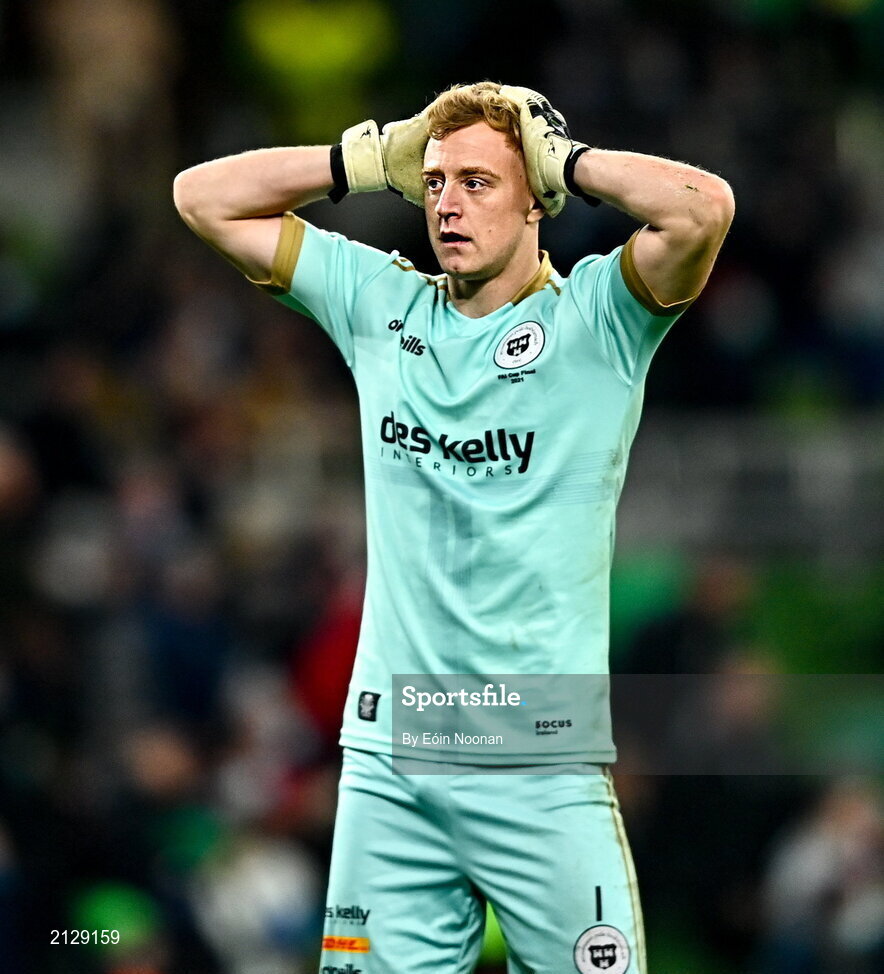 28 November 2021; Bohemians goalkeeper James Talbot reacts to a missed goal chance during the Extra.ie FAI Cup Final match between Bohemians and St Patrick's Athletic at Aviva Stadium in Dublin. Photo by Eóin Noonan/Sportsfile
