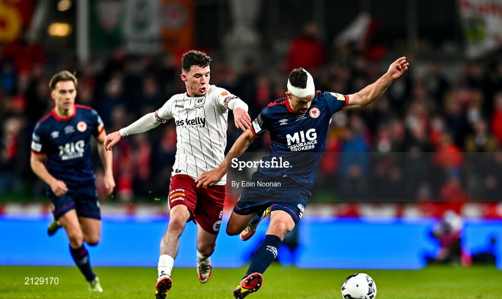 28 November 2021; Robbie Benson of St Patrick's Athletic in action against Ali Coote of Bohemians during the Extra.ie FAI Cup Final match between Bohemians and St Patrick's Athletic at Aviva Stadium in Dublin. Photo by Eóin Noonan/Sportsfile