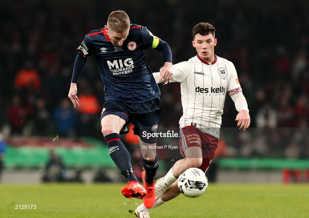 28 November 2021; Ian Bermingham of St Patrick's Athletic in action against Ali Coote of Bohemians during the Extra.ie FAI Cup Final match between Bohemians and St Patrick's Athletic at Aviva Stadium in Dublin. Photo by Michael P Ryan/Sportsfile