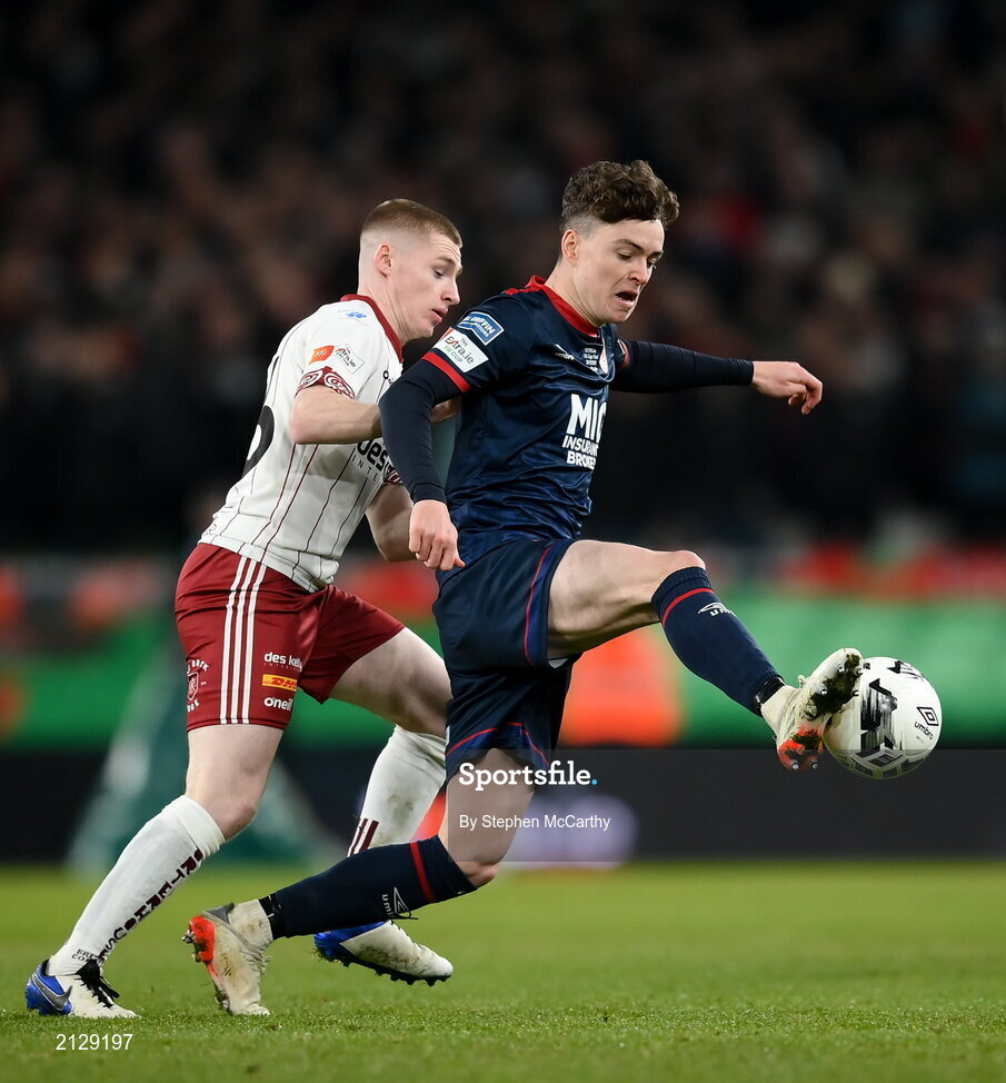 28 November 2021; Alfie Lewis of St Patrick's Athletic in action against Ross Tierney of Bohemians during the Extra.ie FAI Cup Final match between Bohemians and St Patrick's Athletic at Aviva Stadium in Dublin. Photo by Stephen McCarthy/Sportsfile