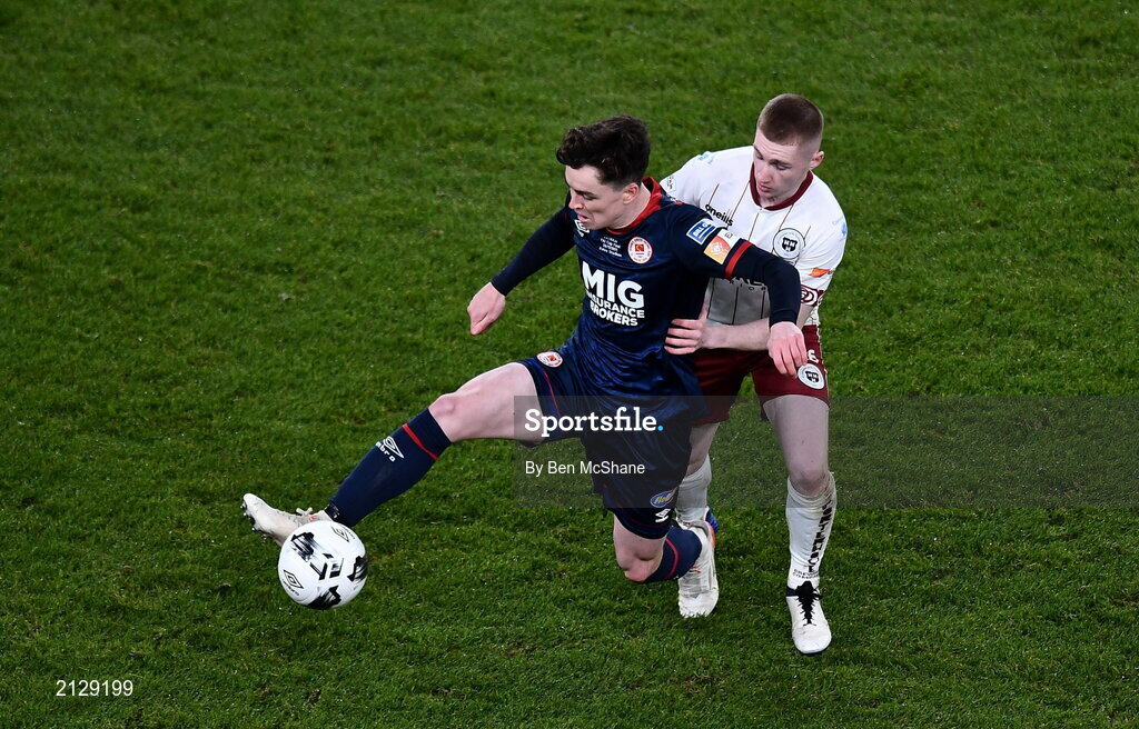 28 November 2021; Alfie Lewis of St Patrick's Athletic in action against Ross Tierney of Bohemians during the Extra.ie FAI Cup Final match between Bohemians and St Patrick's Athletic at Aviva Stadium in Dublin. Photo by Ben McShane/Sportsfile