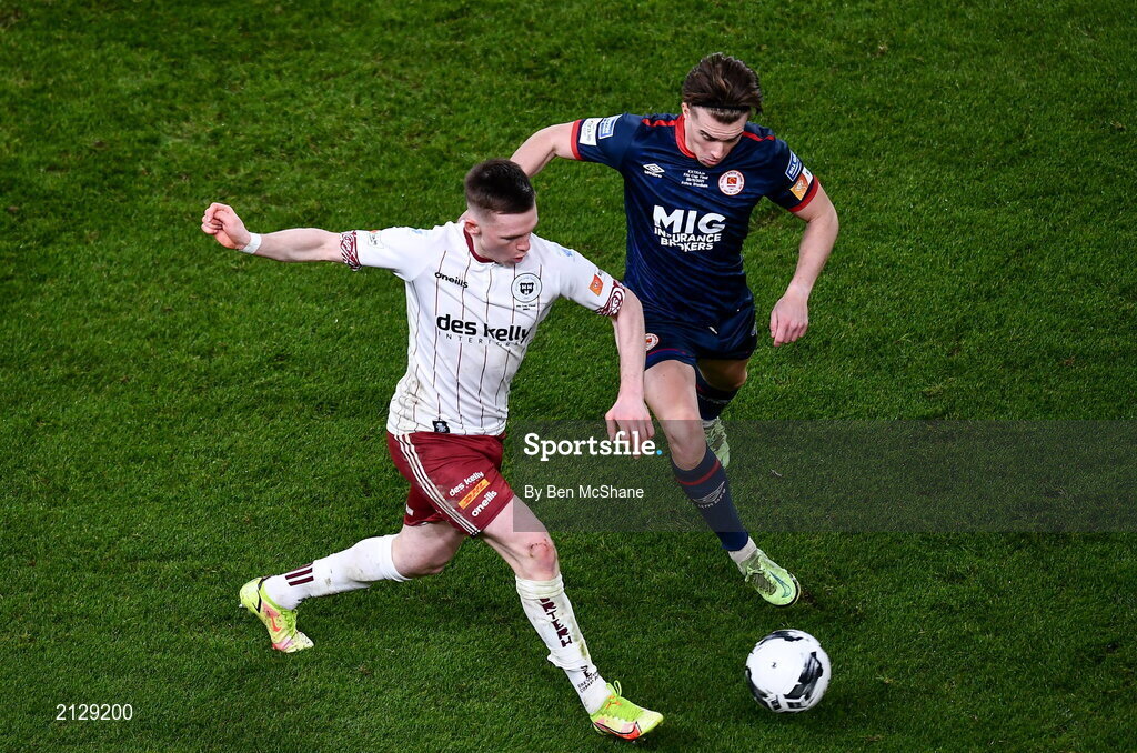 28 November 2021; Andy Lyons of Bohemians in action against Matty Smith of St Patrick's Athletic during the Extra.ie FAI Cup Final match between Bohemians and St Patrick's Athletic at Aviva Stadium in Dublin. Photo by Ben McShane/Sportsfile