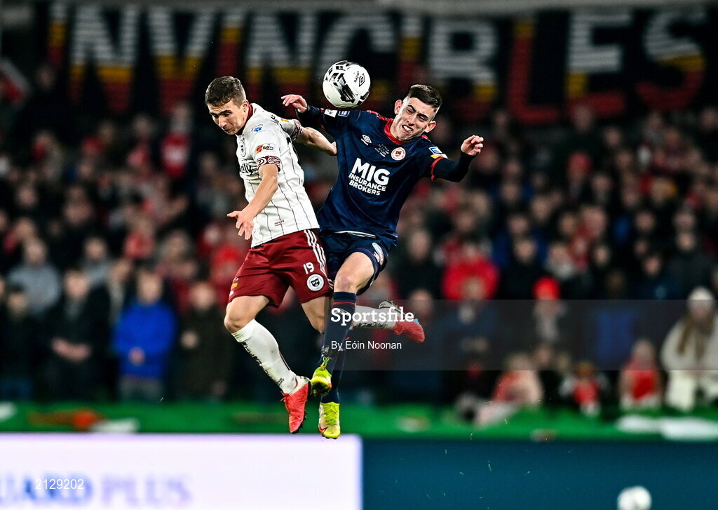 28 November 2021; Tyreke Wilson of Bohemians in action against Darragh Burns of St Patrick's Athletic during the Extra.ie FAI Cup Final match between Bohemians and St Patrick's Athletic at Aviva Stadium in Dublin. Photo by Eóin Noonan/Sportsfile