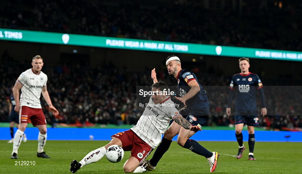28 November 2021; Rob Cornwall of Bohemians and Robbie Benson of St Patrick's Athletic during the Extra.ie FAI Cup Final match between Bohemians and St Patrick's Athletic at Aviva Stadium in Dublin. Photo by Stephen McCarthy/Sportsfile