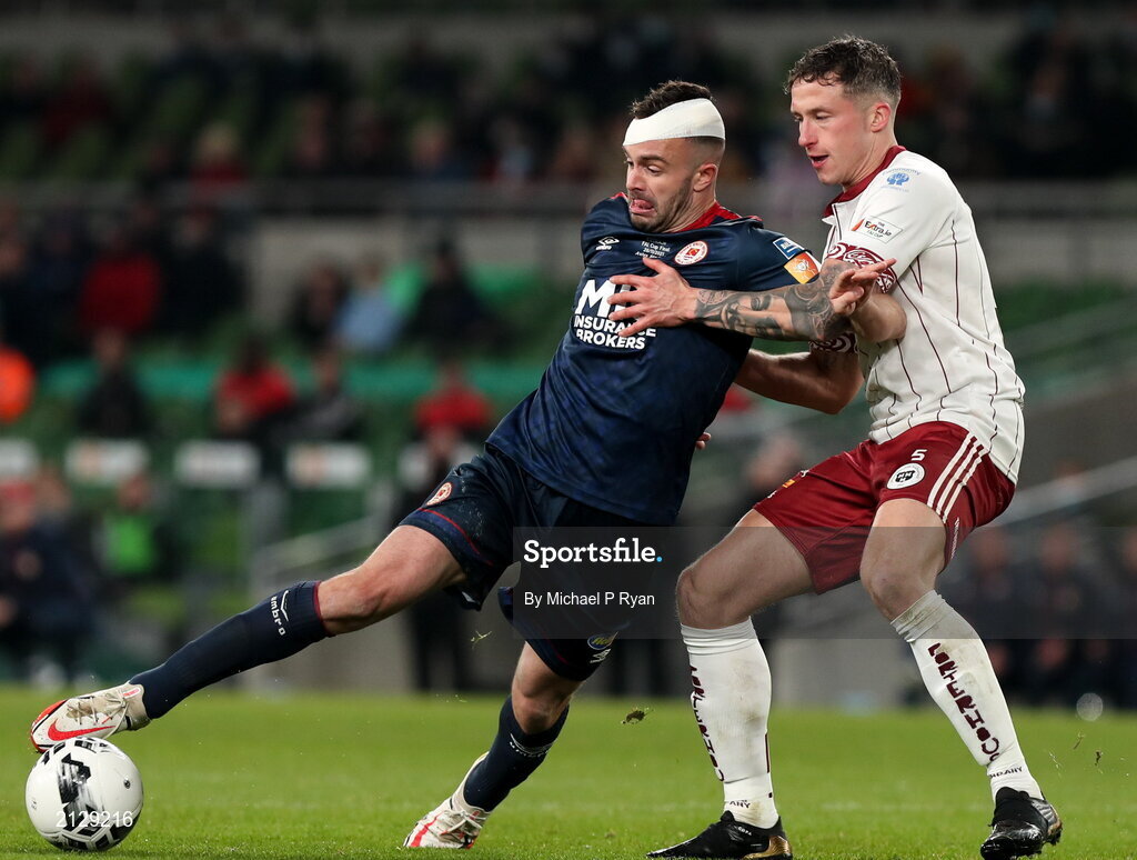 28 November 2021; Robbie Benson of St Patrick's Athletic in action against Rob Cornwall of Bohemians during the Extra.ie FAI Cup Final match between Bohemians and St Patrick's Athletic at Aviva Stadium in Dublin. Photo by Michael P Ryan/Sportsfile