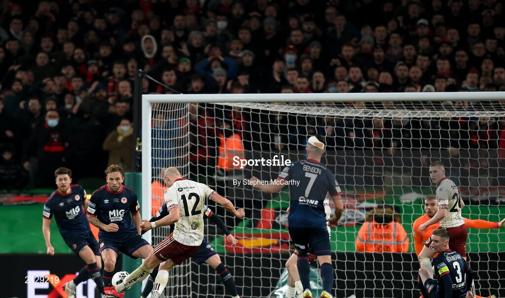28 November 2021; Georgie Kelly of Bohemians shoots at goal during the Extra.ie FAI Cup Final match between Bohemians and St Patrick's Athletic at Aviva Stadium in Dublin. Photo by Stephen McCarthy/Sportsfile