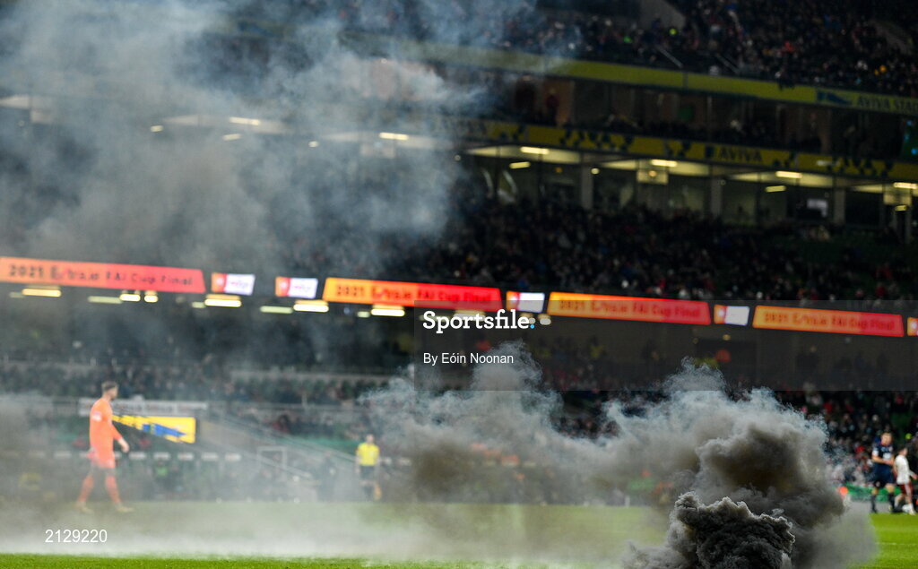 28 November 2021; A flare on the pitch causing a brief stoppage in play during the Extra.ie FAI Cup Final match between Bohemians and St Patrick's Athletic at the Aviva Stadium in Dublin. Photo by Eóin Noonan/Sportsfile