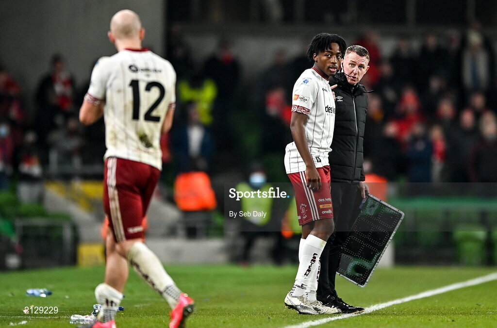28 November 2021; Promise Omochere, right, replaces Bohemians team-mate Georgie Kelly during the Extra.ie FAI Cup Final match between Bohemians and St Patrick's Athletic at Aviva Stadium in Dublin. Photo by Seb Daly/Sportsfile