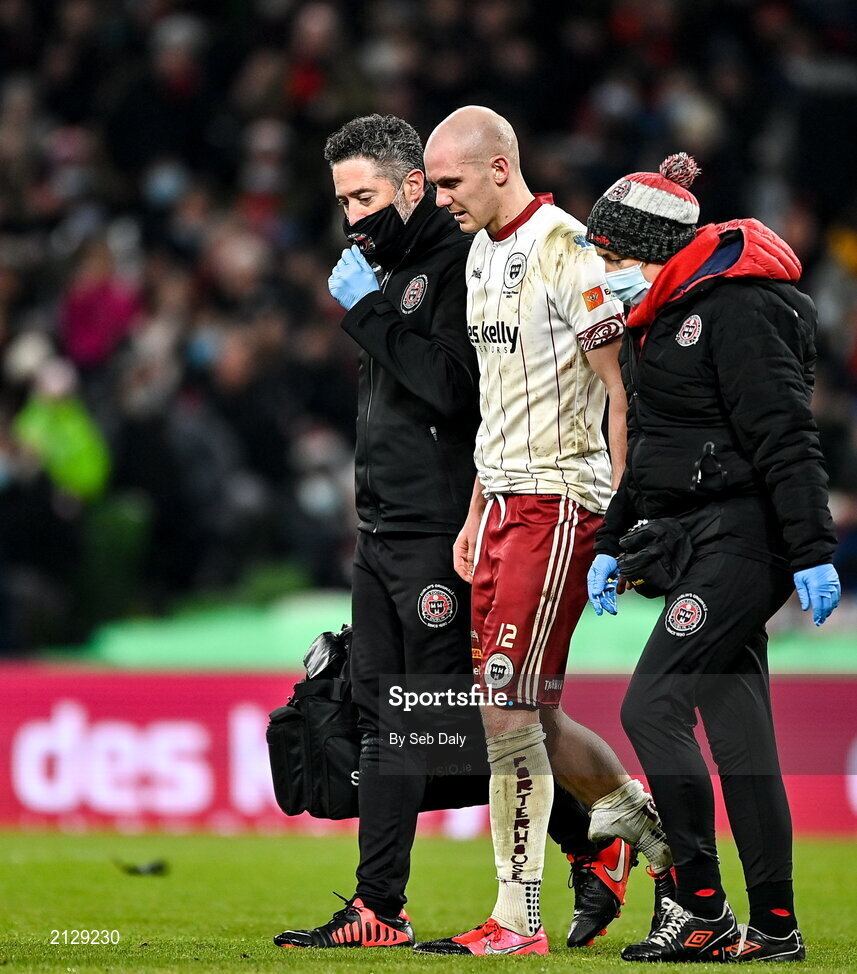 28 November 2021; Georgie Kelly of Bohemians leaves the pitch after sustaining an injury during the Extra.ie FAI Cup Final match between Bohemians and St Patrick's Athletic at Aviva Stadium in Dublin. Photo by Seb Daly/Sportsfile
