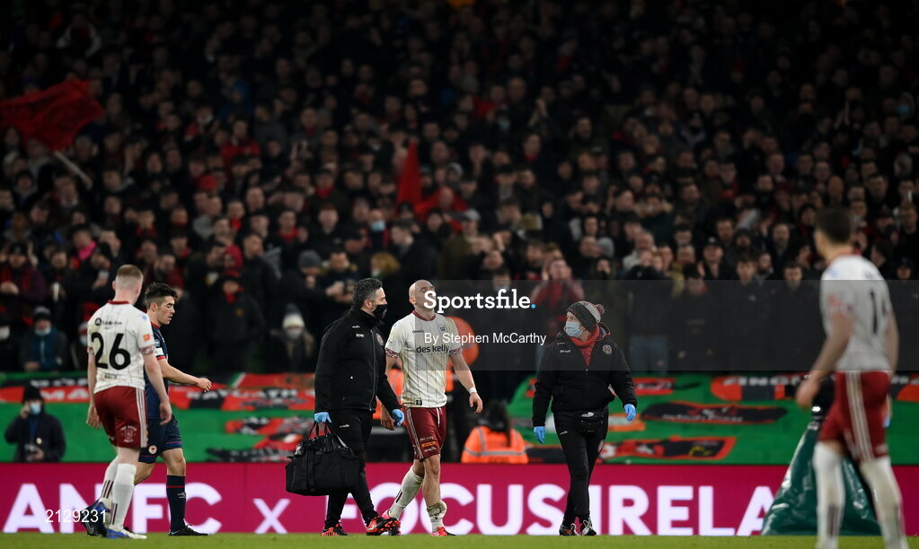 28 November 2021; Georgie Kelly of Bohemians leaves the pitch after sustaining an injury during the Extra.ie FAI Cup Final match between Bohemians and St Patrick's Athletic at Aviva Stadium in Dublin. Photo by Stephen McCarthy/Sportsfile