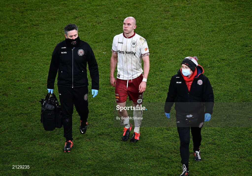 28 November 2021; Georgie Kelly of Bohemians makes his way off the pitch after picking up an injury during the Extra.ie FAI Cup Final match between Bohemians and St Patrick's Athletic at Aviva Stadium in Dublin. Photo by Ben McShane/Sportsfile