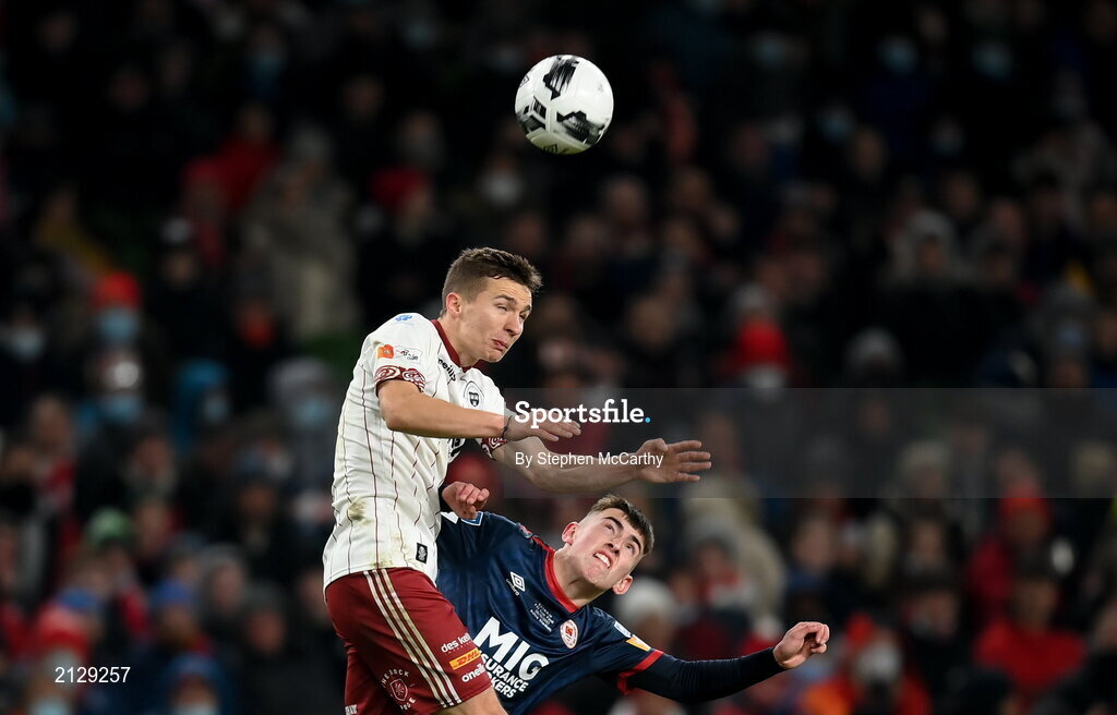 28 November 2021; Tyreke Wilson of Bohemians in action against Darragh Burns of St Patrick's Athletic during the Extra.ie FAI Cup Final match between Bohemians and St Patrick's Athletic at Aviva Stadium in Dublin. Photo by Stephen McCarthy/Sportsfile