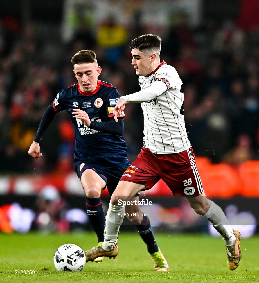 28 November 2021; Dawson Devoy of Bohemians in action against Darragh Burns of St Patrick's Athletic during the Extra.ie FAI Cup Final match between Bohemians and St Patrick's Athletic at Aviva Stadium in Dublin. Photo by Eóin Noonan/Sportsfile