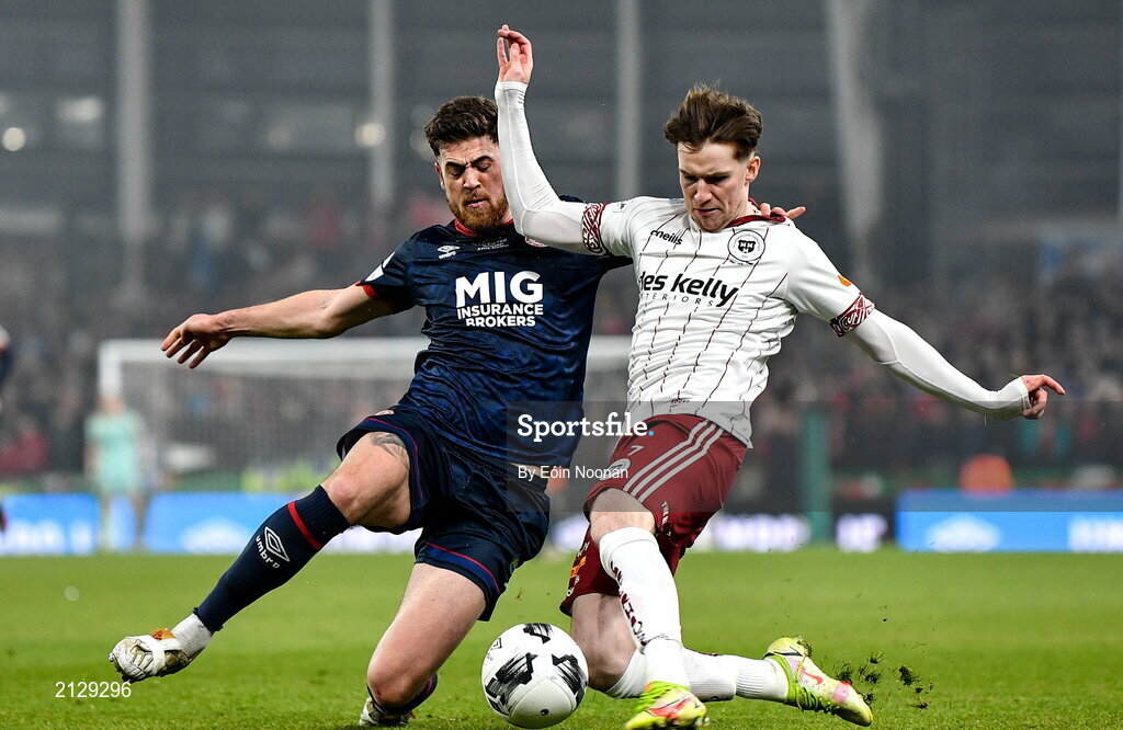 28 November 2021; Stephen Mallon of Bohemians in action against Sam Bone of St Patrick's Athletic during the Extra.ie FAI Cup Final match between Bohemians and St Patrick's Athletic at the Aviva Stadium in Dublin. Photo by Eóin Noonan/Sportsfile