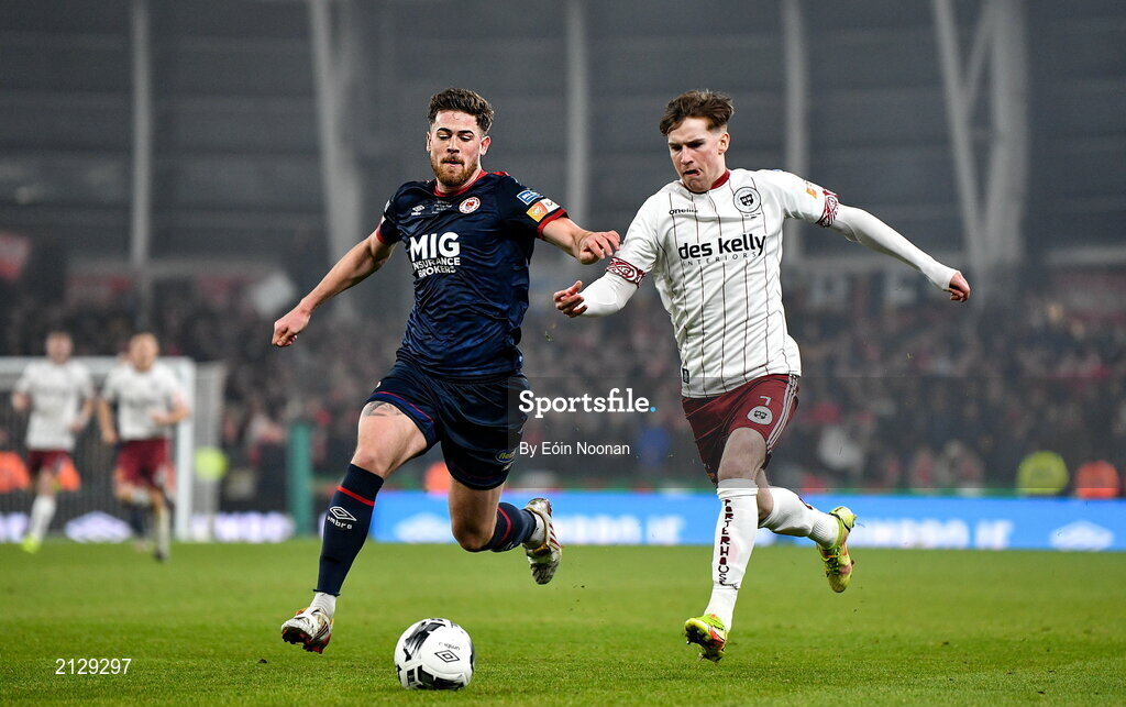 28 November 2021; Stephen Mallon of Bohemians in action against Sam Bone of St Patrick's Athletic during the Extra.ie FAI Cup Final match between Bohemians and St Patrick's Athletic at the Aviva Stadium in Dublin. Photo by Eóin Noonan/Sportsfile