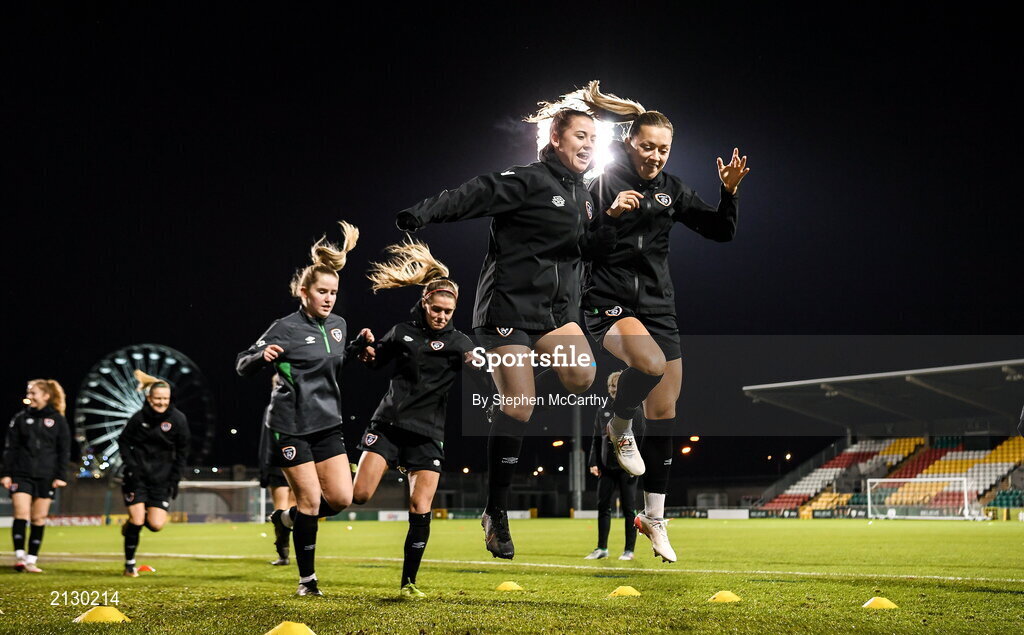 29 November 2021; Emily Whelan, left and Katie McCabe during a Republic of Ireland Women training session at Tallaght Stadium in Dublin. Photo by Stephen McCarthy/Sportsfile