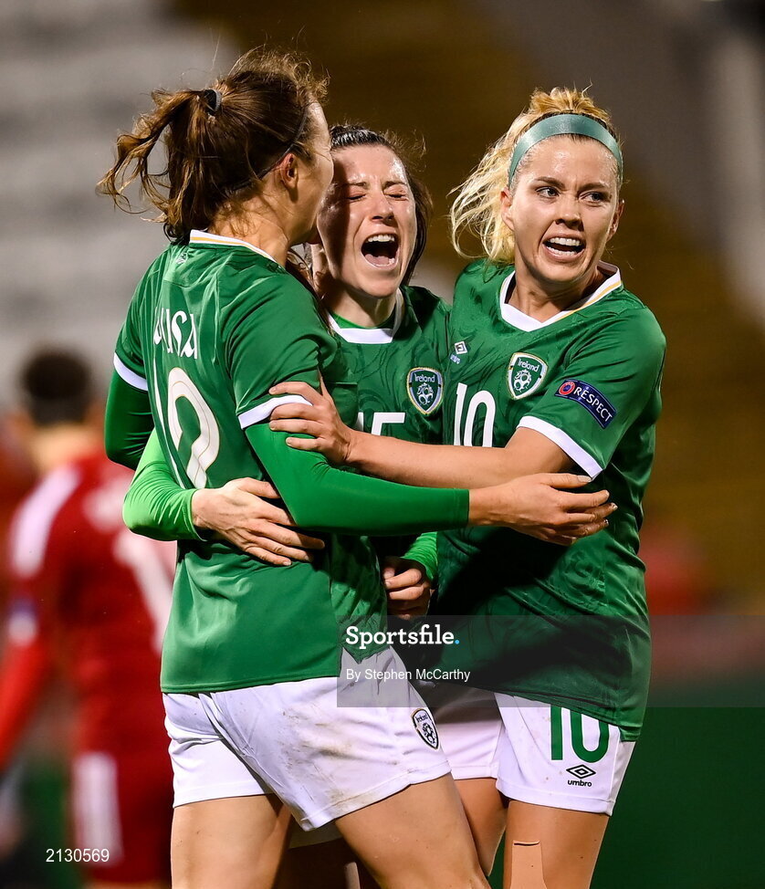 30 November 2021; Lucy Quinn of Republic of Ireland celebrates with teammates Kyra Carusa, left, and Denise O'Sullivan, right, after scoring her side's third goal during the FIFA Women's World Cup 2023 qualifying group A match between Republic of Ireland and Georgia at Tallaght Stadium in Dublin. Photo by Stephen McCarthy/Sportsfile
