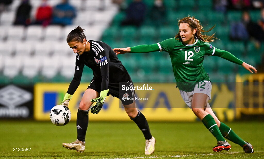 30 November 2021; Georgia goalkeeper Teona Sukhashvili under pressure from Kyra Carusa of Republic of Ireland during the FIFA Women's World Cup 2023 qualifying group A match between Republic of Ireland and Georgia at Tallaght Stadium in Dublin. Photo by Eóin Noonan/Sportsfile