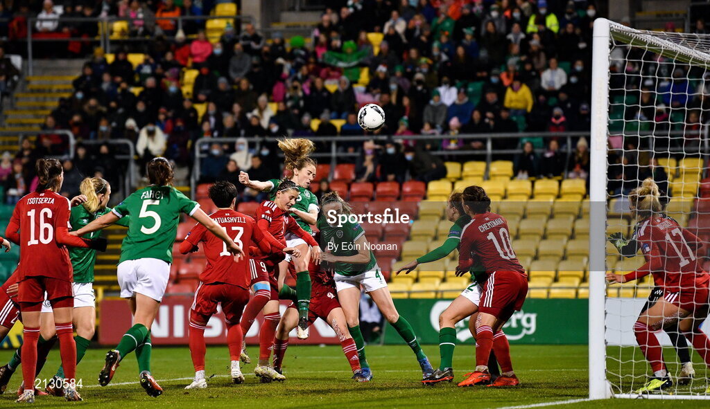 30 November 2021; Megan Connolly of Republic of Ireland heads at goal during the FIFA Women's World Cup 2023 qualifying group A match between Republic of Ireland and Georgia at Tallaght Stadium in Dublin. Photo by Eóin Noonan/Sportsfile