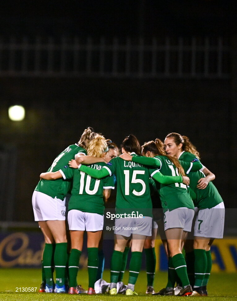 30 November 2021; The Republic of Ireland team huddle during the FIFA Women's World Cup 2023 qualifying group A match between Republic of Ireland and Georgia at Tallaght Stadium in Dublin. Photo by Eóin Noonan/Sportsfile