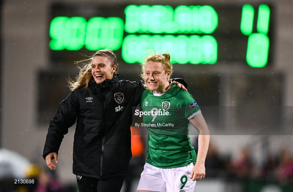30 November 2021; Jamie Finn, left, and Amber Barrett of Republic of Ireland after the FIFA Women's World Cup 2023 qualifying group A match between Republic of Ireland and Georgia at Tallaght Stadium in Dublin. Photo by Stephen McCarthy/Sportsfile