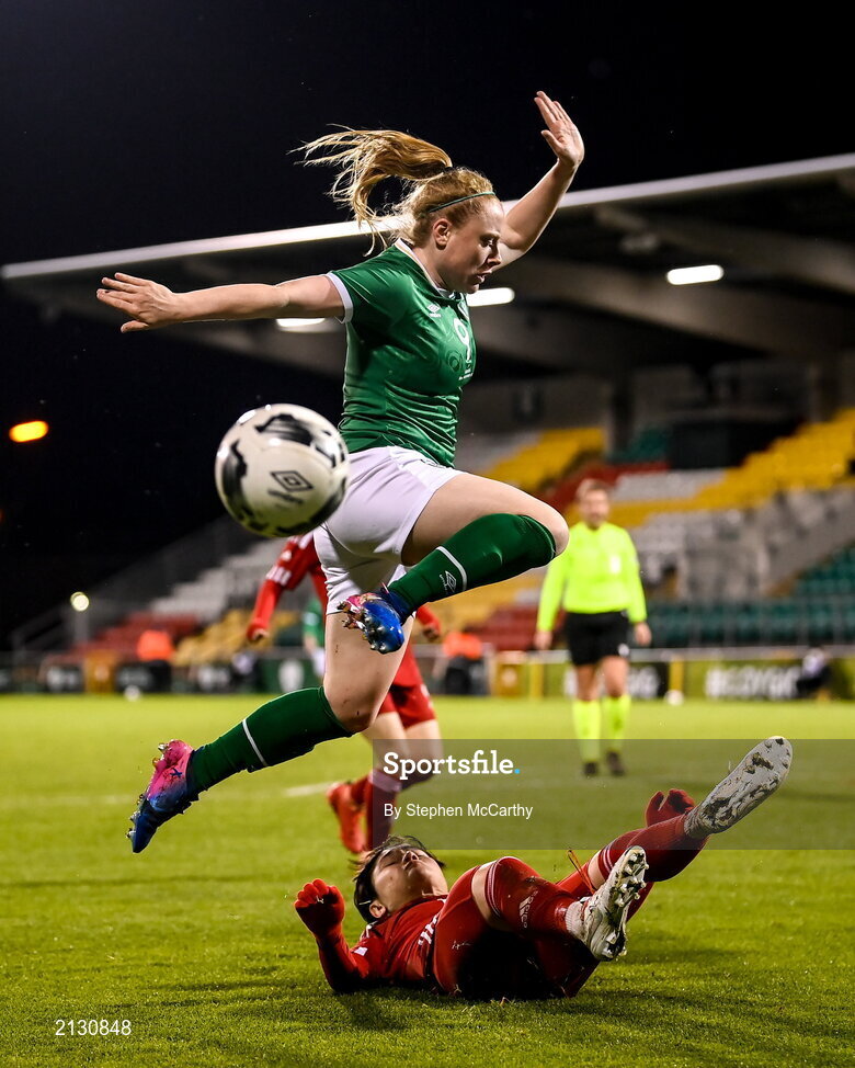 30 November 2021; Amber Barrett of Republic of Ireland in action against Tamari Tatuashvili of Georgia during the FIFA Women's World Cup 2023 qualifying group A match between Republic of Ireland and Georgia at Tallaght Stadium in Dublin. Photo by Stephen McCarthy/Sportsfile