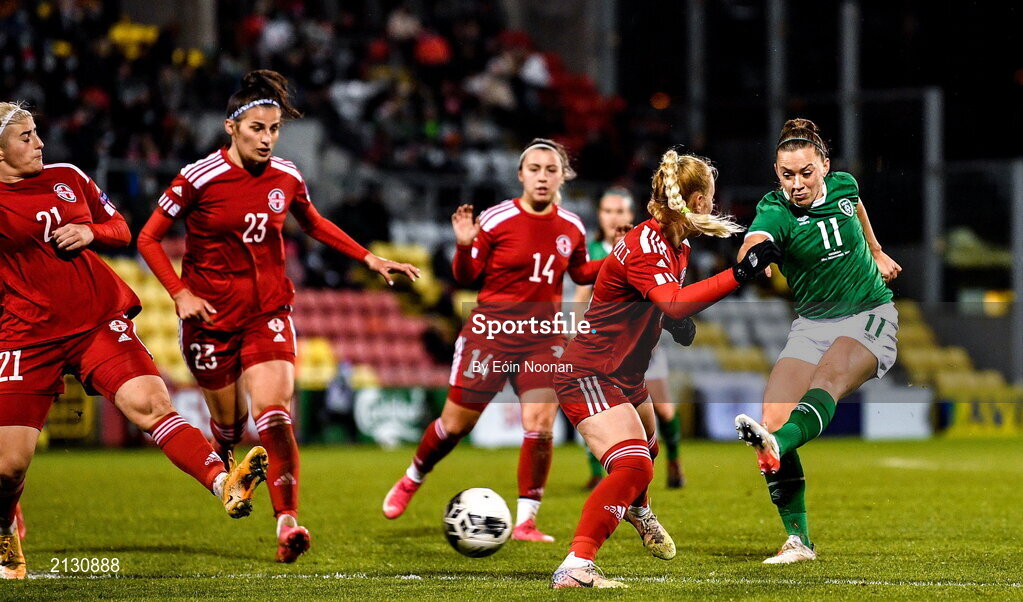 30 November 2021; Katie McCabe of Republic of Ireland has a shot on goal during the FIFA Women's World Cup 2023 qualifying group A match between Republic of Ireland and Georgia at Tallaght Stadium in Dublin. Photo by Eóin Noonan/Sportsfile