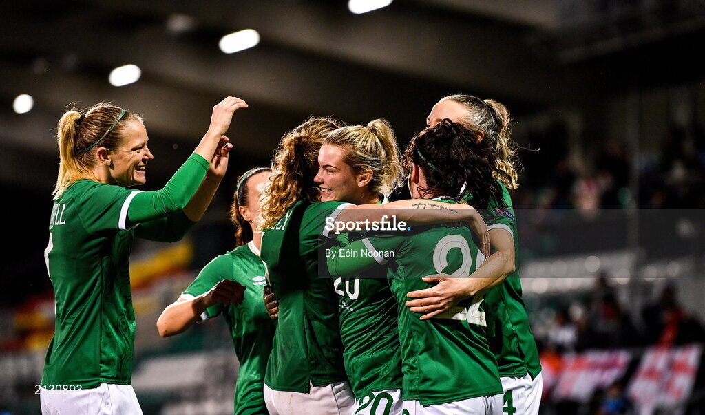 30 November 2021; Saoirse Noonan of Republic of Ireland celebrates with team-mates after scoring her side's ninth goal during the FIFA Women's World Cup 2023 qualifying group A match between Republic of Ireland and Georgia at Tallaght Stadium in Dublin. Photo by Eóin Noonan/Sportsfile