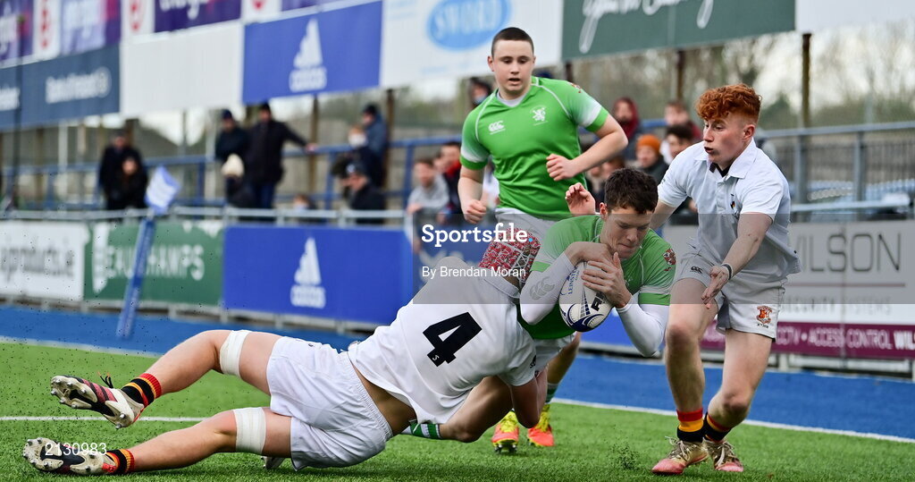 1 December 2021; Hugh Goddard of Gonzaga scores his side's first try despite the tackle of Ross Mackey of Presentation College during the Bank of Ireland Leinster Rugby Schools Senior League Division 1A Semi-Final match between Presentation College, Bray and Gonzaga at Energia Park in Dublin. Photo by Brendan Moran/Sportsfile