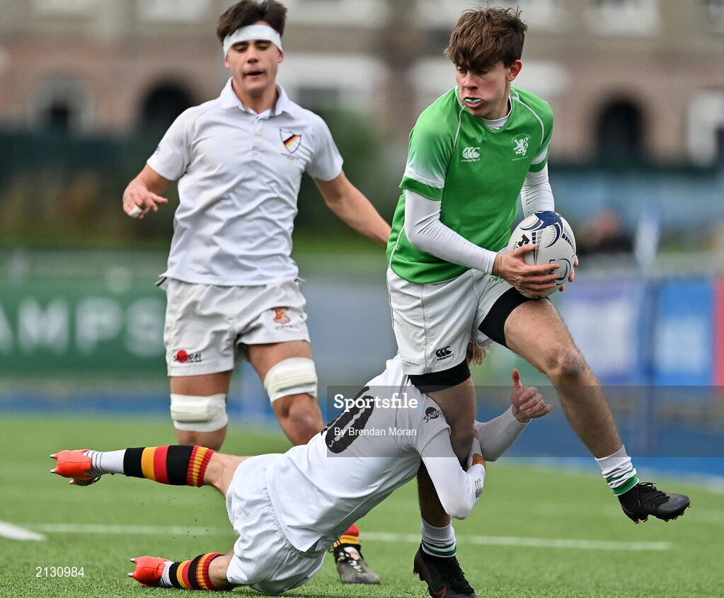 1 December 2021; Stephen McMahon of Gonzaga is tackled by Jack Murphy of Presentation College during the Bank of Ireland Leinster Rugby Schools Senior League Division 1A Semi-Final match between Presentation College, Bray and Gonzaga at Energia Park in Dublin. Photo by Brendan Moran/Sportsfile