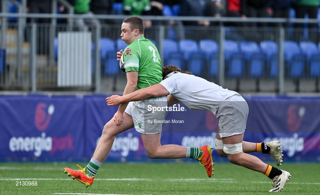 1 December 2021; Tim Cotter of Gonzaga is tackled by Sam Nolan of Presentation College during the Bank of Ireland Leinster Rugby Schools Senior League Division 1A Semi-Final match between Presentation College, Bray and Gonzaga at Energia Park in Dublin. Photo by Brendan Moran/Sportsfile