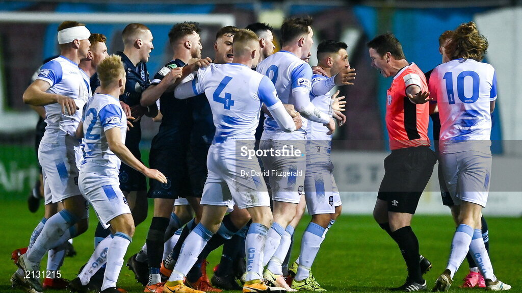 26 March 2021; Referee Eoghan O'Shea stops players from approaching Glen McAuley of Shelbourne during the SSE Airtricity League First Division match between Galway United and Shelbourne at Eamonn Deacy Park in Galway. Photo by David Fitzgerald/Sportsfile