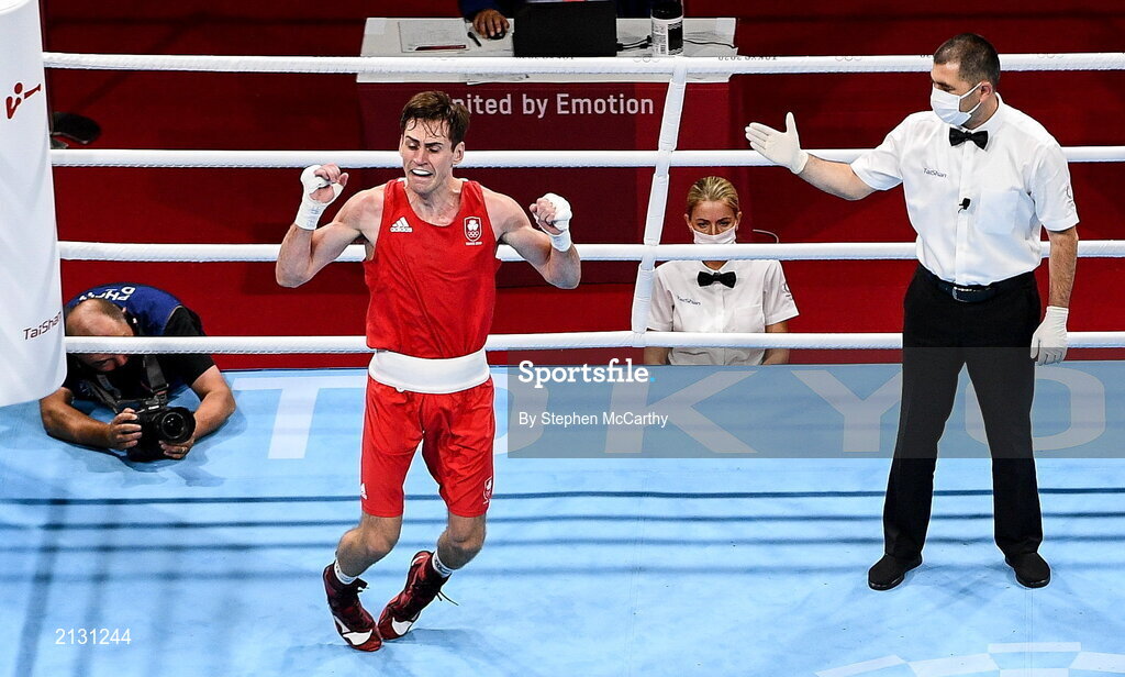 30 July 2021; Aidan Walsh of Ireland injures his ankle while being declared victorious over Merven Clair of Mauritius by referee Mansur Muhiddinov following their men's welterweight quarter-final bout at the Kokugikan Arena during the 2020 Tokyo Summer Olympic Games in Tokyo, Japan. Photo by Stephen McCarthy/Sportsfile