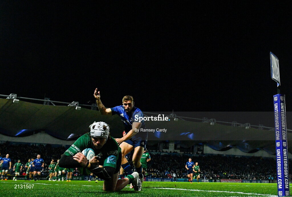 3 December 2021; Mack Hansen of Connacht scores his side's first try during the United Rugby Championship match between Leinster and Connacht at the RDS Arena in Dublin. Photo by Ramsey Cardy/Sportsfile
