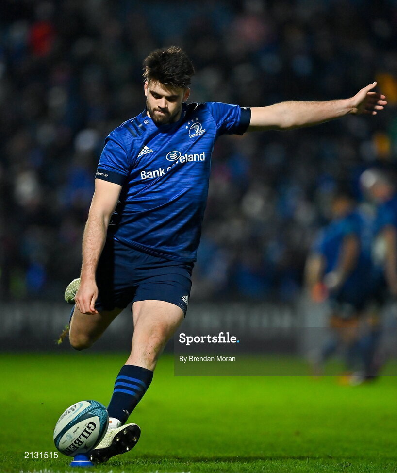 3 December 2021; Harry Byrne of Leinster kicks a conversion during the United Rugby Championship match between Leinster and Connacht at the RDS Arena in Dublin. Photo by Brendan Moran/Sportsfile