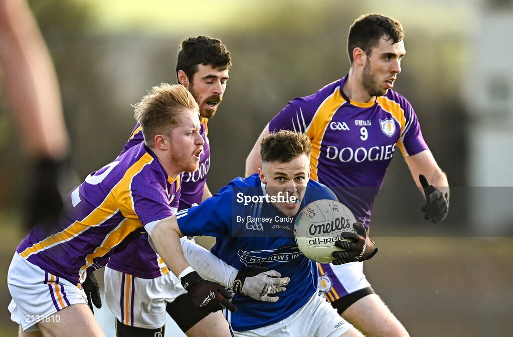 4 December 2021; Emmett McNabb of Dromore is tackled by Leigh Jones of Derrygonnelly Harps during the AIB Ulster GAA Football Senior Club Championship Quarter-Final match between Dromore and Derrygonnelly Harps at Páirc Colmcille in Carrickmore, Tyrone. Photo by Ramsey Cardy/Sportsfile