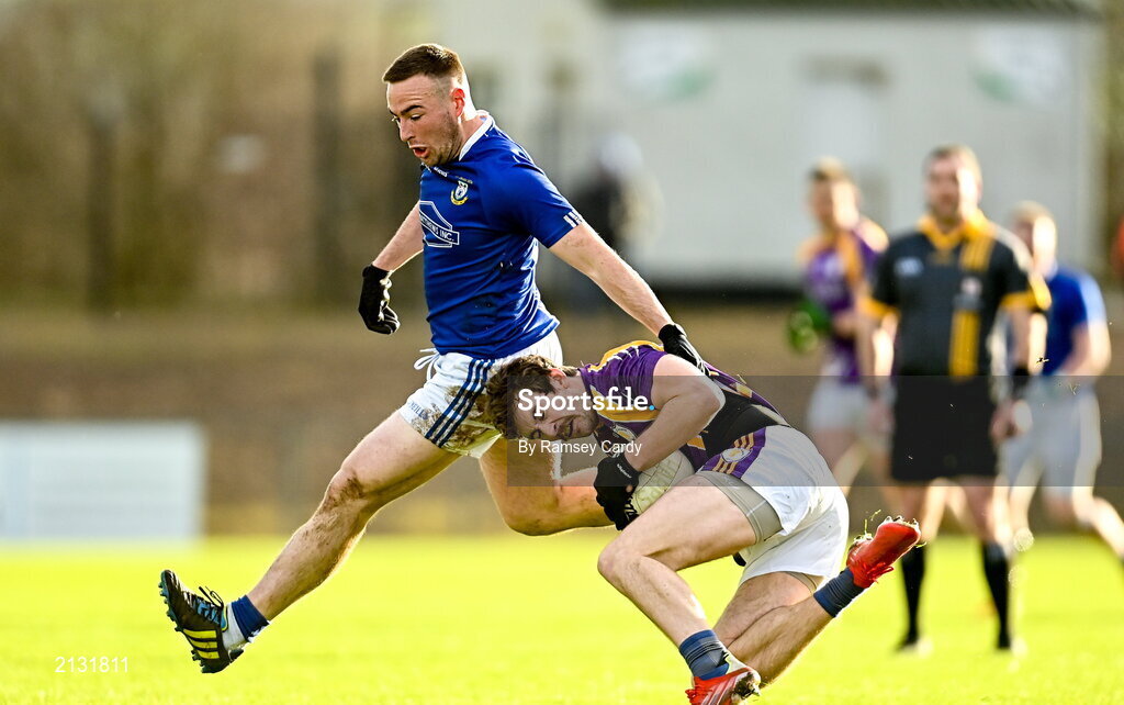 4 December 2021; Stephen Gilroy of Derrygonnelly Harps is tackled by Tiarnan Sludden of Dromore during the AIB Ulster GAA Football Senior Club Championship Quarter-Final match between Dromore and Derrygonnelly Harps at Páirc Colmcille in Carrickmore, Tyrone. Photo by Ramsey Cardy/Sportsfile